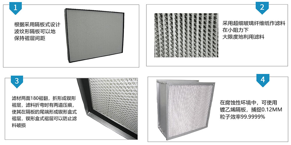 耐高溫高效過濾器是用超細(xì)玻璃纖維濾紙,鋁箔分隔板;