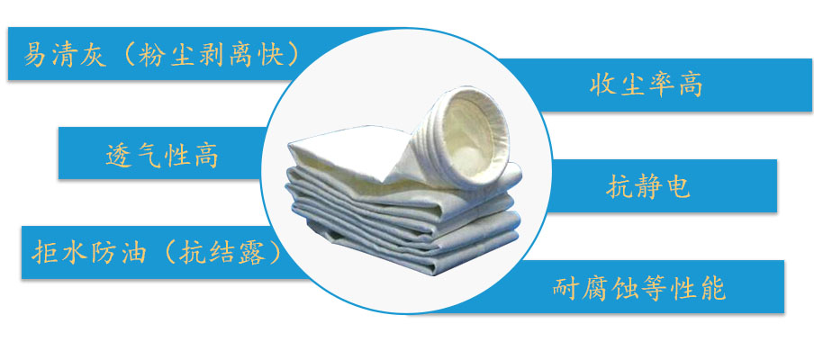 濾袋采用玻纖基布和化學纖維混合針刺而成。產品具有耐磨性能好、抗拉強度高。正常使用溫度150℃,短時180℃。適用于溫度適宜、煙塵濃度高、過濾要求高的煙塵過濾行業。1、表面未完濾效率高:通常工業用濾材是深層過濾。它是依賴于在濾材表面先建立一次粉塵層而達到過濾。建立過濾時間長,阻力大,效率低,截留不 ,過濾和反吹壓力高,清灰頻繁,能耗較高,使用壽命不長,設備占地面積大。使用覆膜除塵濾袋濾料,粉塵不能透入濾料,是表面過濾,無論是粗,細粉塵,全部沉積在濾料表面,即靠膜本身孔徑截留被濾物,無初濾期,開始就是過濾,近的時間處于過濾。