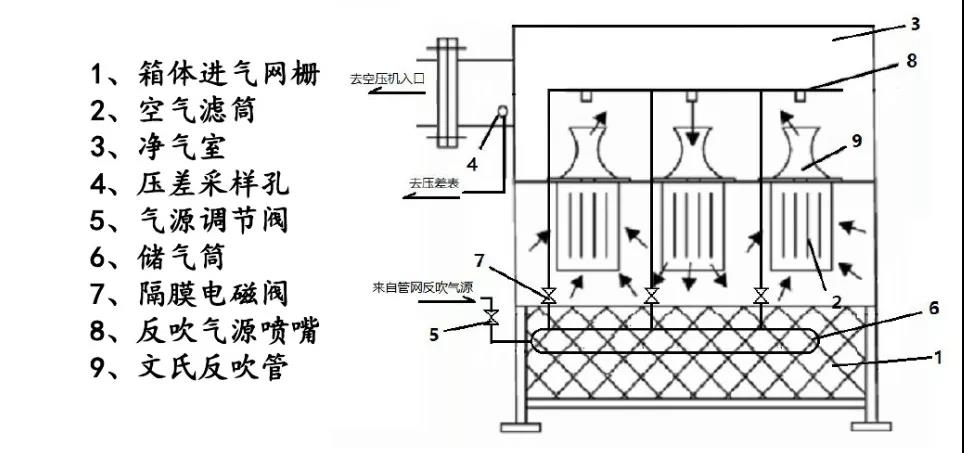 過濾過程: 含塵空氣經空氣壓縮機吸氣作用,從一級粗過濾箱①吸入,經過高效過濾筒②,由于重力慣性、擴散、接觸阻留等綜合作用,塵埃被吸附在高效過濾筒上,潔凈空氣通過密封墊圈③進入文氏管④到凈氣室⑤匯合到集氣口⑥再從凈氣出口管⑦被空壓機吸入。